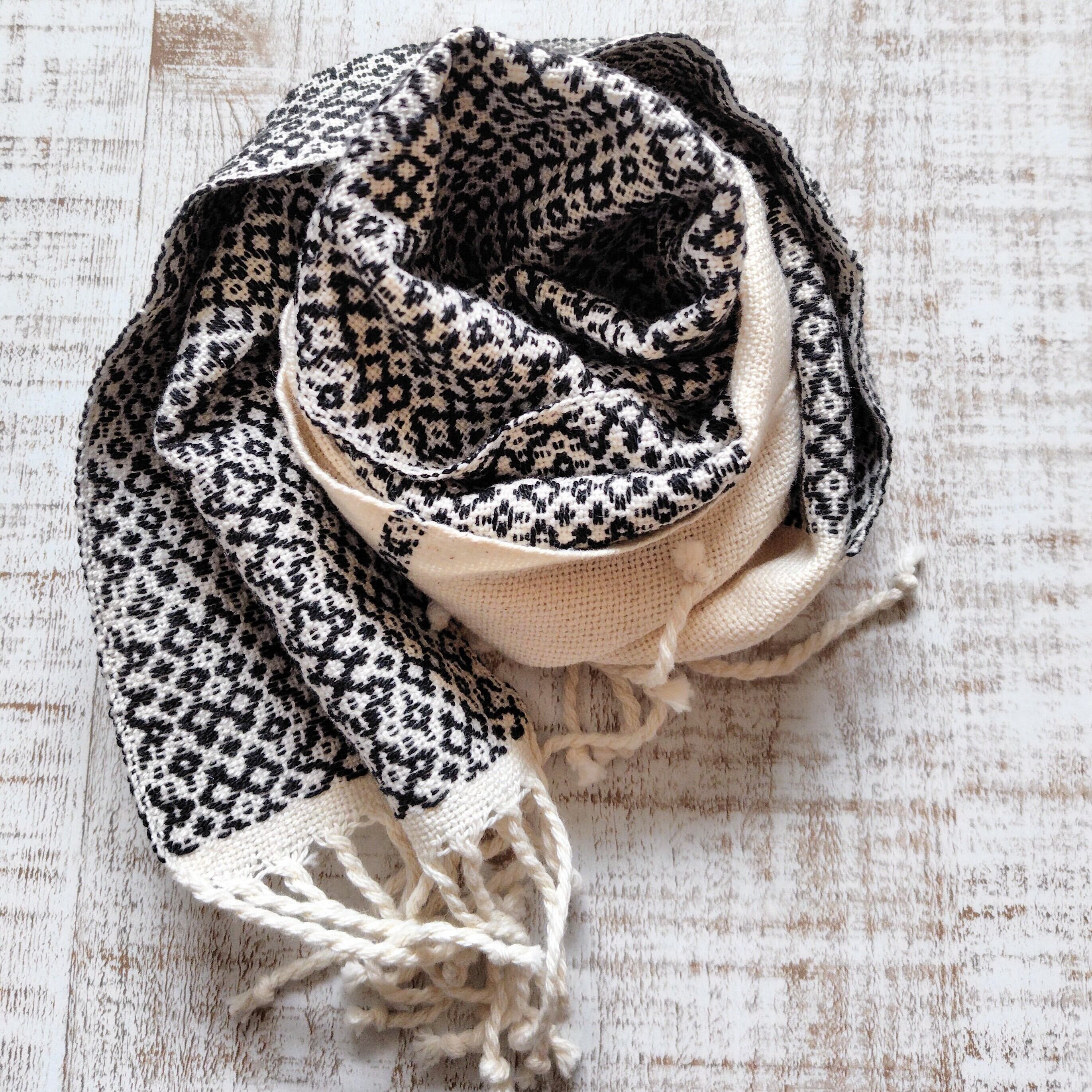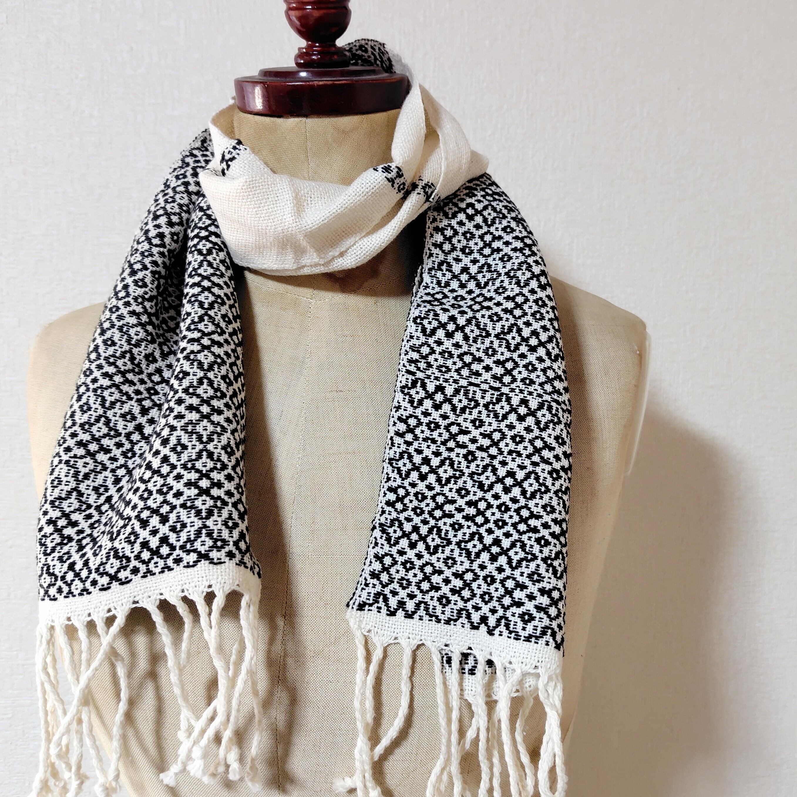 上質コットン手織り 浮き織り ミニマフラー ミニストール *ブラック&ホワイト