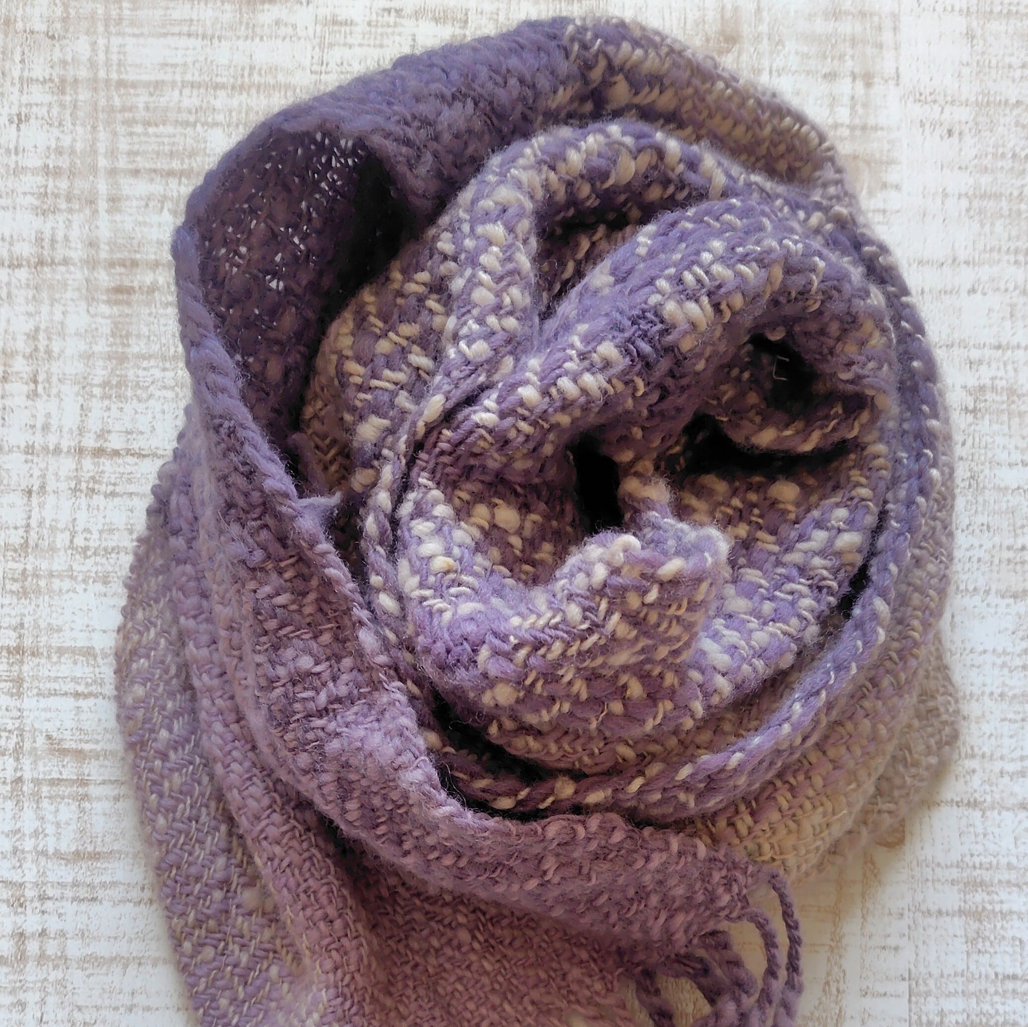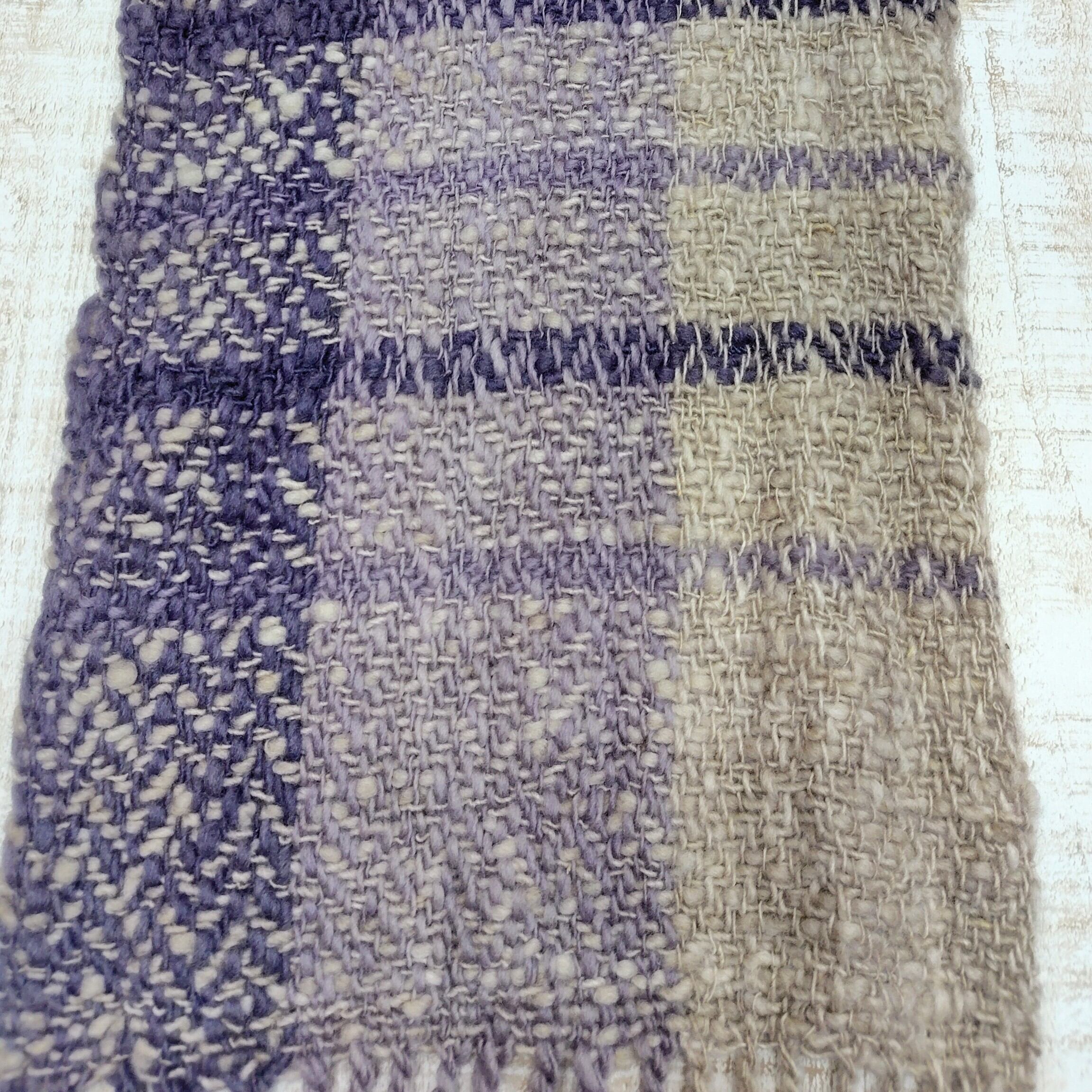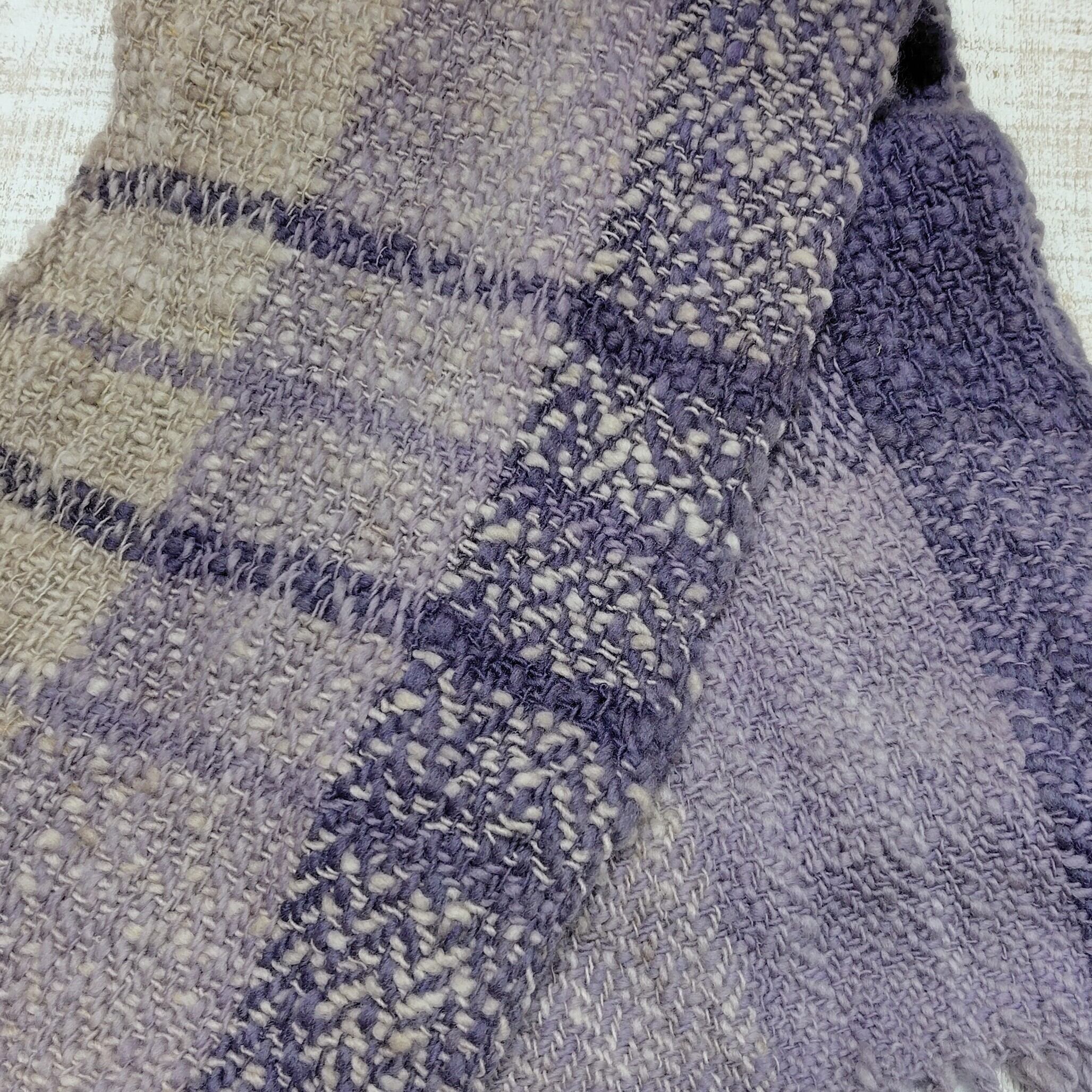 落ち着いた紫に染まった、草木染め手織りマフラー ログウッド染め ホームスパン