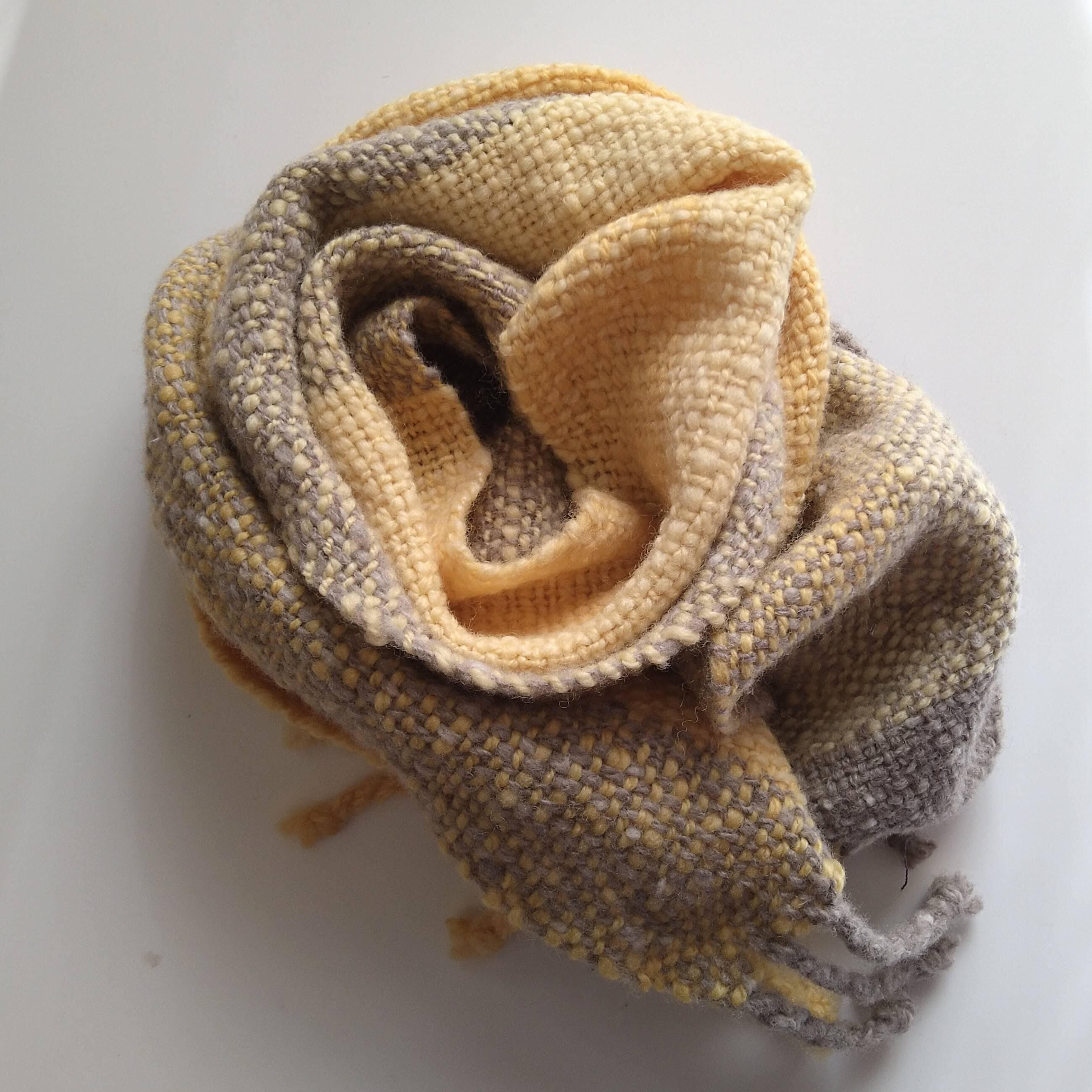 グレーの部分は天然の羊の色、黄色はハナモツヤクという染料で染めています。