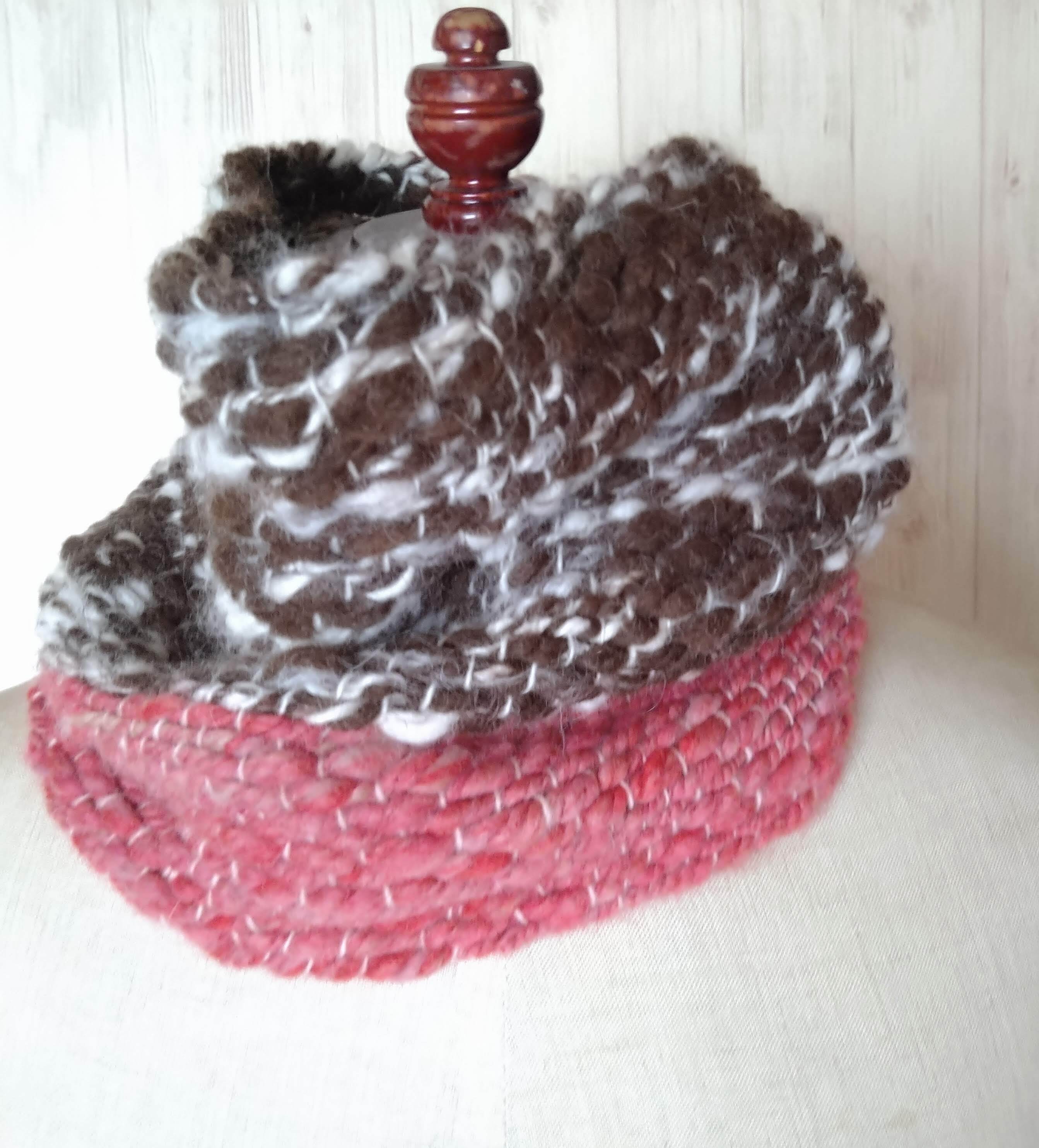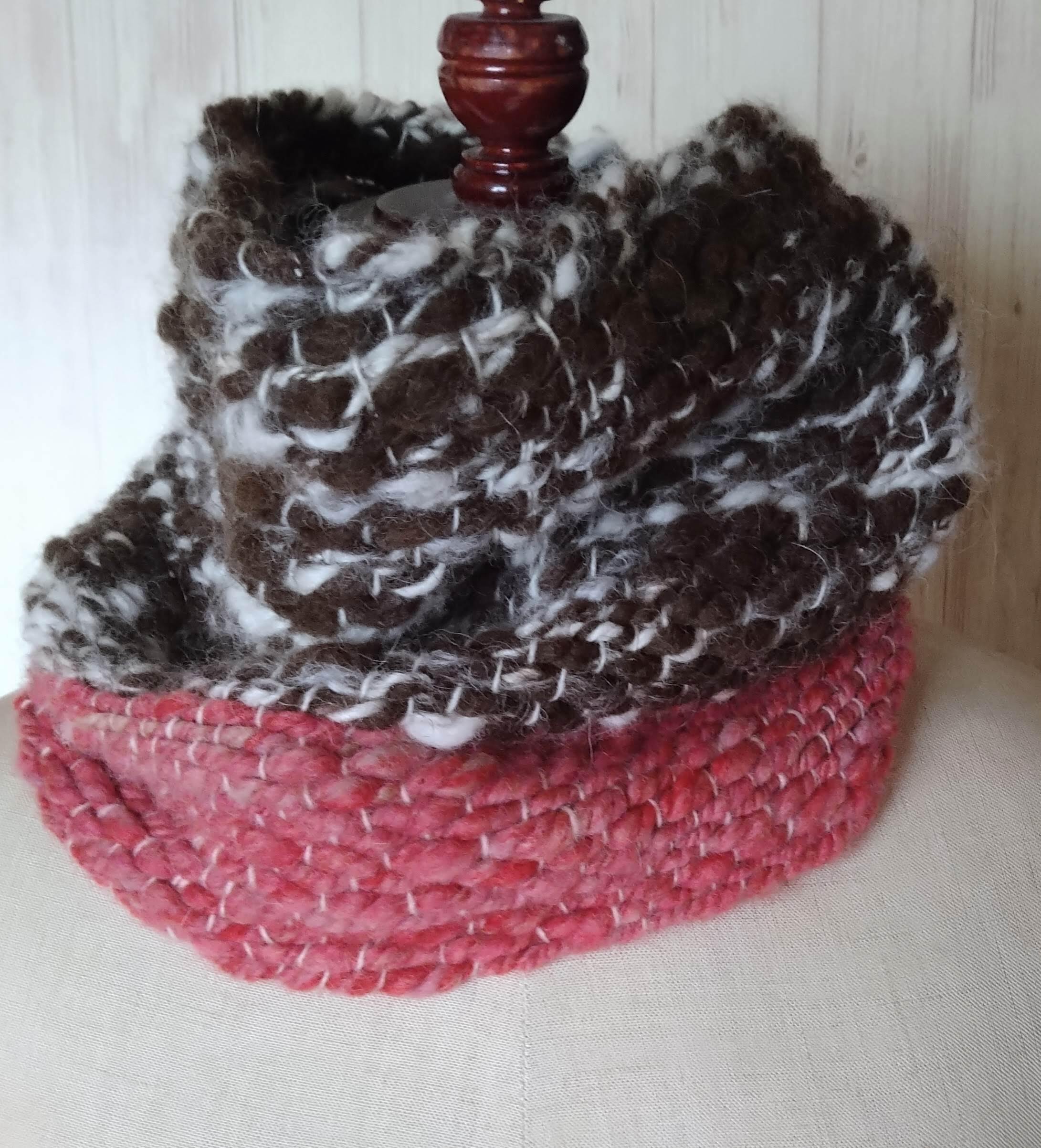 手紡ぎ糸の手織りスヌード 茶×赤 メリノウール&アルパカ
