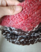 このスヌードを作るために茶系の部分はアルパカとウール、赤い部分はオリジナルに染めた羊毛を混ぜて紡いで織り上げています。